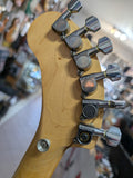 Made in Korea circa 2003, the WR-150 is a Strat-style electric from Washburns Pro / Chicago Series line. It features an HSS pickup layout, a quilted maple veneer top with transparent red finish, and a standard 6-screw tremolo bridge.