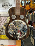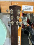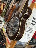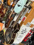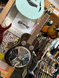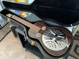 Classic square-neck resonator with vintage 1930s-inspired tone. All-mahogany construction with gloss translucent black finish. Deluxe USA-made spun aluminum cone for rich, crisp resonance. Golden Gate patented spider bridge with maple saddle. Stunning art deco Black Lightning inlay and period-correct features. In Excellent near new condition! Comes with Lap Dawg Tone Bar, Fingerpicks and Case!