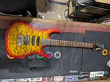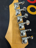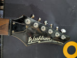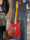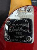 Made in Korea circa 2003, the WR-150 is a Strat-style electric from Washburns Pro / Chicago Series line. It features an HSS pickup layout, a quilted maple veneer top with transparent red finish, and a standard 6-screw tremolo bridge.