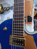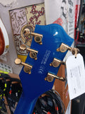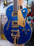 G5655TG Electromatic Center Block Jr. delivers a gamut of tones with sleek looks to match. Gloss finish Azure Metallic. Bigsby B70 vibrato tailpiece and pair of Black Top Broad'Tron pickups. Excellent condition! w/ gigbag and strap