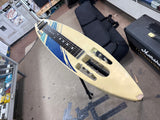 6 string lap steel with a surfboard like figure. Includes gig bag and legs