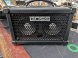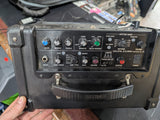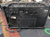 Compact 10-watt stereo bass amp (5W + 5W) with dual 5 inch speakers. Includes five bass preamp types, 3-band EQ, and built-in effects such as chorus, flanger, delay, and reverb. Offers USB audio, stereo line out, aux input, headphone out, and optional Bluetooth. Can run on AC power or batteries. Suitable for practice, recording, and small setups. With PSU.