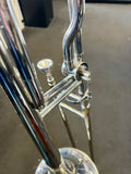 ‘French Engineered’ nickel plated, trigger tenor Bb trombone, with two mouthpieces and padded bag. Good beginner instrument, in fine working condition.