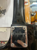Tortoiseshell bound nato neck joined at the 14th fret, slotted headstock, black walnut fingerboard and 4mm pearl dot inlays.
