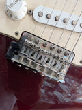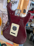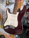 * LEFT HANDED* Made in Mexico, 2002-2003, standard strat with all the usual appointments. Maple neck with rosewood fingerboard, dark maroon finish. With gig bag.