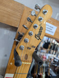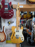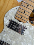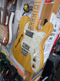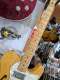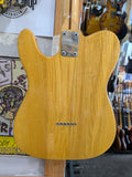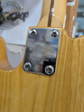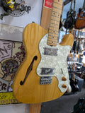 Greco Telecaster Thinline built by the Matsumoku factory in Japan. It has a natural ash semi-hollow body with an F-hole, a maple neck with a skunk stripe, and the original star-logo tuners used by Matsumoku in this period. The pickups are the original Greco embossed wide range units, which are humbucker-sized single-coils. Hardware includes the correct 6-saddle Tele bridge and pearloid pickguard. The neck plate is stamped MATSUMOKU / MADE IN JAPAN, consistent with Greco production from roughly 1973 - 1976. Non original knobs.