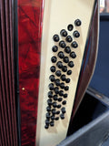 Bellows and keys all working correctly, however, there are some issues with the bass buttons, a fair few are stuck down and operating incorrectly, definitely needs some TLC, sold AS IS. With hard case.