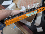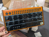 The Behringer Crave is a semi-modular monophonic analog synthesizer featuring a 3340 VCO, 24dB ladder filter, 32-step sequencer, arpeggiator, and full patch matrix. It includes USB and MIDI connectivity, can integrate with modular systems, and offers external audio processing. With box and PSU.