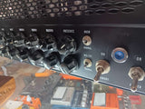 15-watt, all-tube lunchbox guitar head designed for high-gain metal, featuring three ECC83, one ECC82, and two EL84 tubes. It offers two channels (clean/distortion) with independent EQs, a footswitchable boost, and a mid-cut function for modern metal tones, all housed in a compact metal chassis.