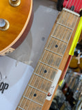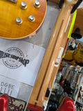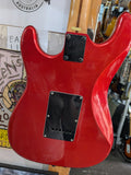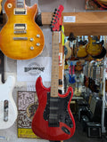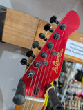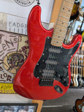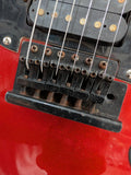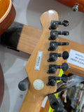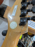 Made in Japan, for Texas Guitars, HSS strat copy. Needs some love. Fingerboard has some serious discolouration. Electronics need some attention, seems to all work but some contact cleaner wouldn’t go astray. Missing one saddle spring. Headstock is splitting at the back across the first tuner. It’s sparkly red though.